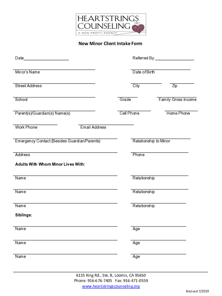 New Minor Client Intake Form DateReferred By:Minors Name Date of Bradstreet AddressCitySchoolGradeParent(s)/Guardian(s) Name(s)Cell Homework Phonetic Family Gross Income Home Phonemic AddressEmergency