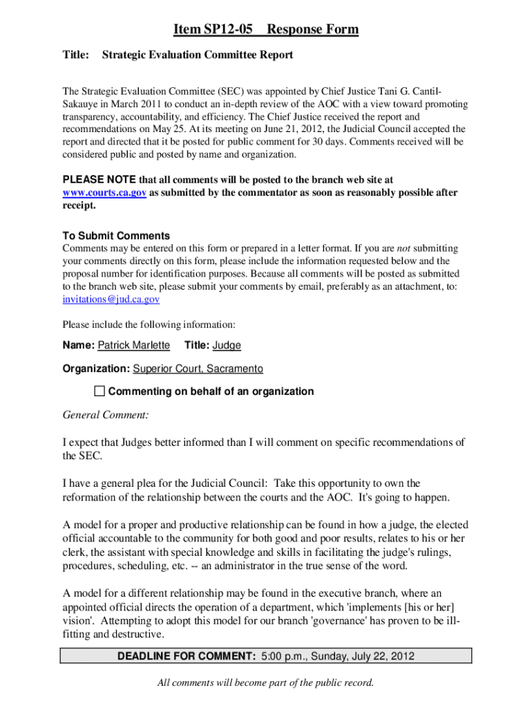 Item SP1205 Response Form Title:Strategic Evaluation Committee Reportage Strategic Evaluation Committee (SEC) was appointed by Chief Justice Tank G. CantilSakauye in March 2011 to conduct an in depth
