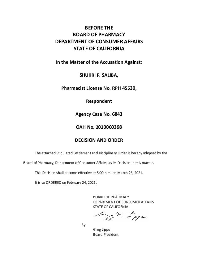 BEFORE THE BOARD OF PHARMACY DEPARTMENT OF CONSUMER AFFAIRS STATE OF CALIFORNIA In the Matter of the Accusation Against: SHARI F. SALIVA, Pharmacist License No. MPH 45530, Respondent Agency Case No.