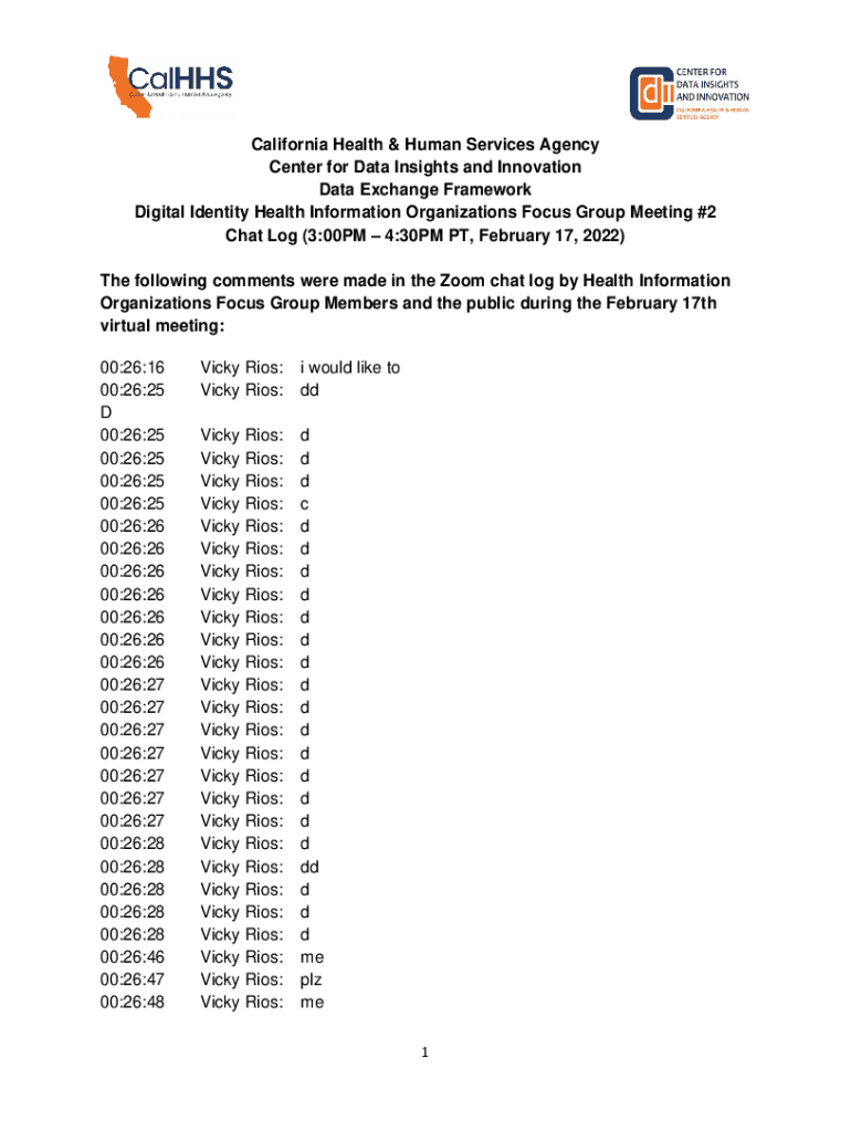 California Health & Human Services Agency Center for Data Insights and Innovation Data Exchange Framework Digital Identity Health Information Organizations Focus Group Meeting #2 Chat Log (3:00PM