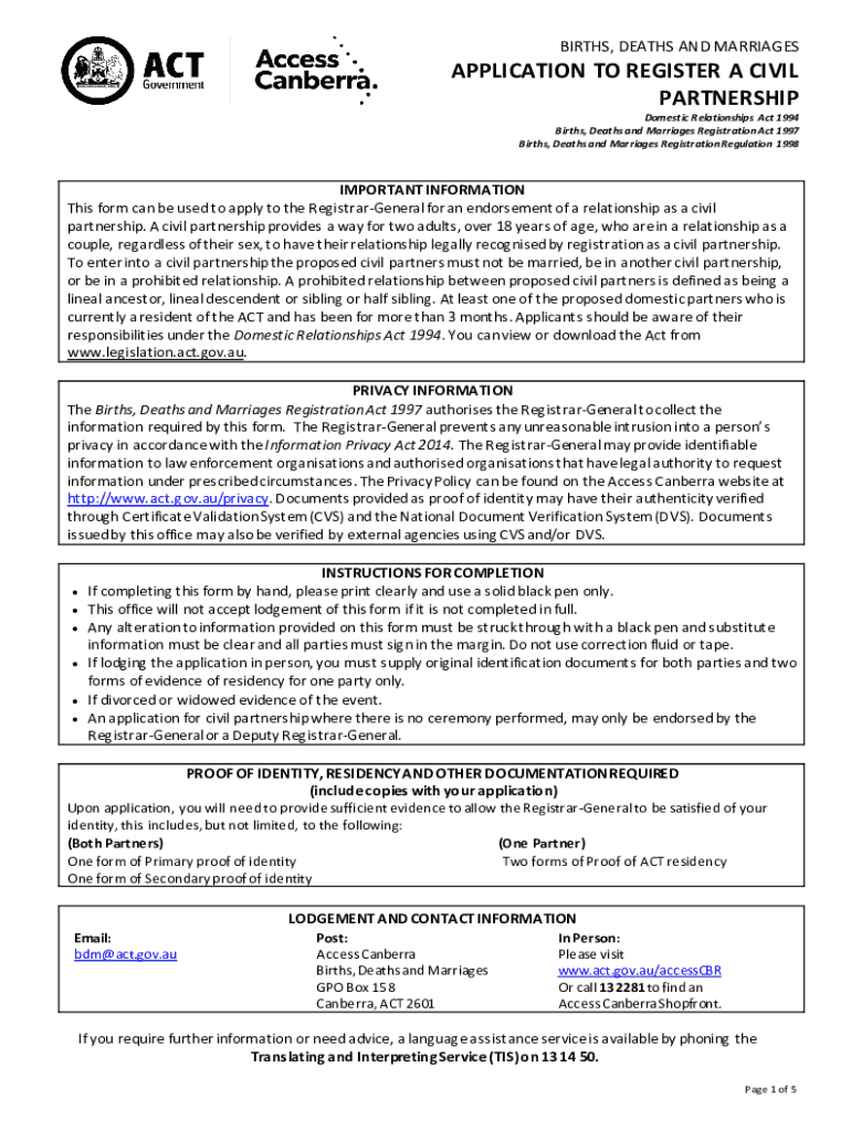 BIRTHS, DEATHS AND MARRIAGESAPPLICATION TO REGISTER A CIVIL PARTNERSHIP Domestic Relationships Act 1994 Births, Deaths and Marriages Registration Act 1997 Births, Deaths and Marriages Registration