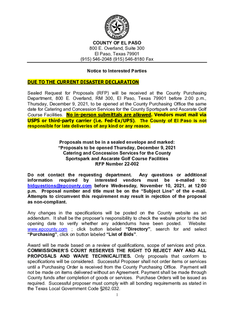 COUNTY OF EL PASO 800 E. Overland, Suite 300 El Paso, Texas 79901 (915) 5462048 (915) 5468180 Fax Notice to Interested Parties DUE TO THE CURRENT DISASTER DECLARATION Sealed Request for Proposals