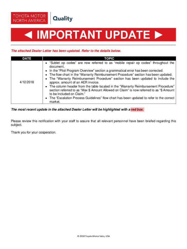 IMPORTANT UPDATE The attached Dealer Letter has been updated. Refer to the details below. DATE4/12/2018TOPIC Sublet op codes are now referred to as mobile repair op codes throughout the document.