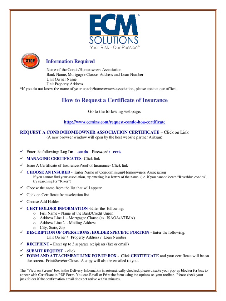 Information Required Name of the Condo/Homeowners Association Bank Name, Mortgagee Clause, Address and Loan Number Unit Owner Name Unit Property Address *If you do not know the name of your condo/homeowners