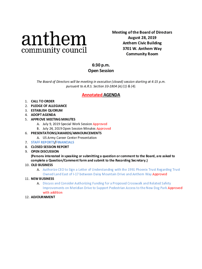 Meeting of the Board of Directors August 28, 2019, Anthem Civic Building 3701 W. Anthem Way Community Room6:30 p.m. Open Session The Board of Directors will be meeting in executive (closed) session
