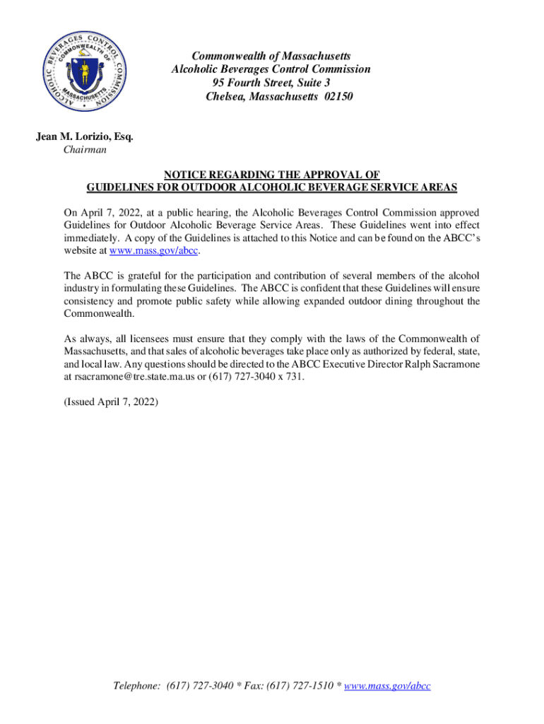 Commonwealth of Massachusetts Alcoholic Beverages Control Commission 95 Fourth Street, Suite 3 Chelsea, Massachusetts 02150Jean M. Origin, Esq. Chairman NOTICE REGARDING THE APPROVAL OF GUIDELINES
