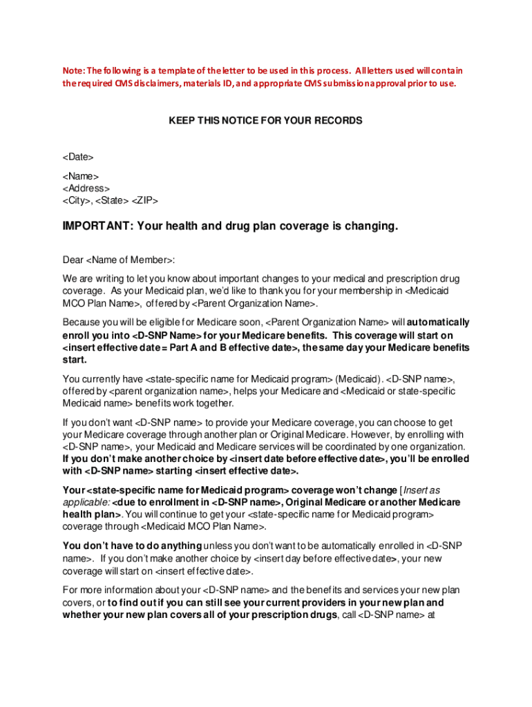 Note: The following is a template of the letter to be used in this process. All letters used will contain the required CMS disclaimers, materials ID, and appropriate CMS submission approval prior