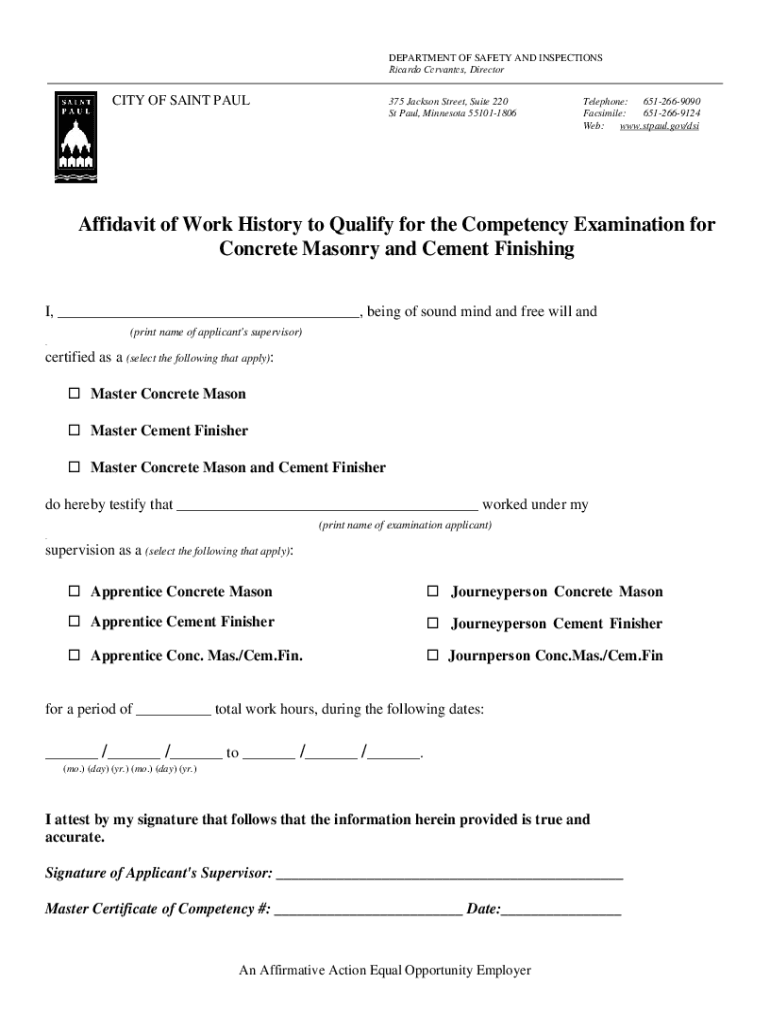 Get the free Affidavit of Work History to Qualify for the Competency Examination ...