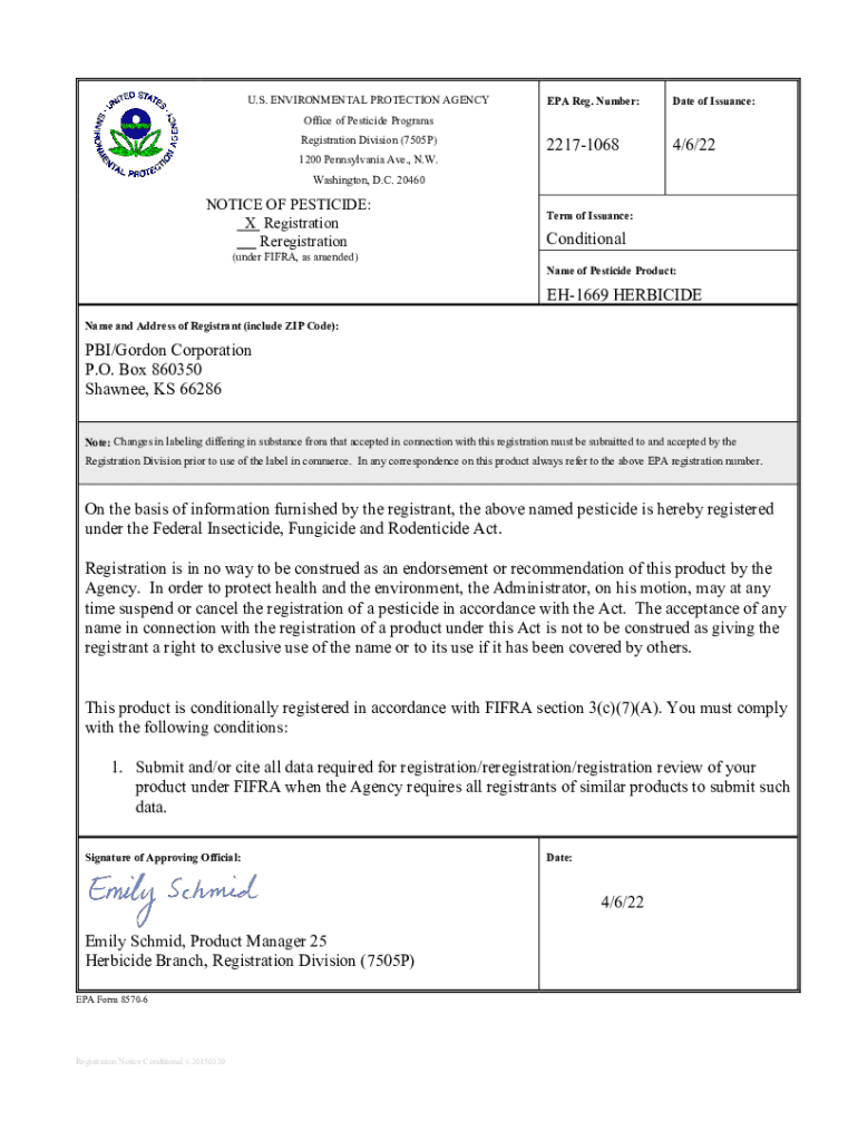 U.S. ENVIRONMENTAL PROTECTION AGENCY EPA Reg. Number:Date of Issuance:221710684/6/22Office of Pesticide Programs Registration Division (7505P) 1200 Pennsylvania Ave., N.W. Washington, D.C. 20460NOTICE