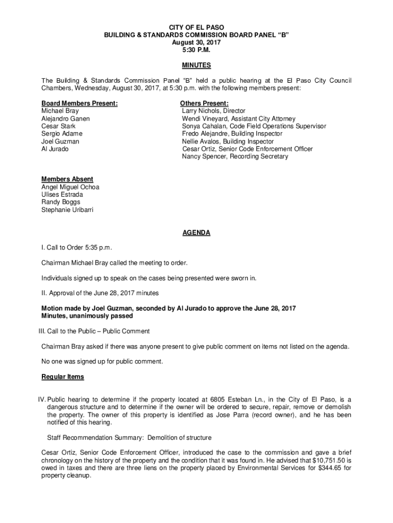 CITY OF EL PASO BUILDING & STANDARDS COMMISSION BOARD PANEL B August 30, 2017 5:30 P.M. MINUTES The Building & Standards Commission Panel B held a public hearing at the El Paso City Council Chambers,