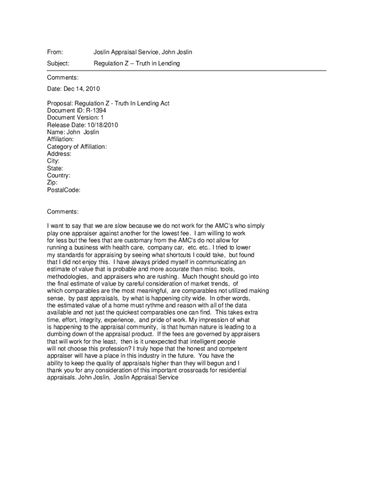 Get the free From: Joslin Appraisal Service, John Joslin Subject: Regulation Z ...