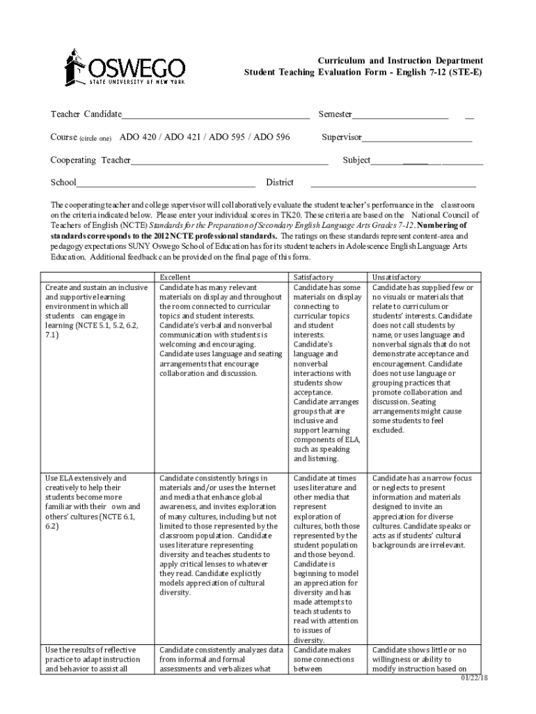 Curriculum and Instruction Department Student Teaching Evaluation Form English 712 (SEE)Teacher Candidate___ Semester___ Course (circle one) ADO 420 / ADO 421 / ADO 595 / ADO 596Supervisor___Cooperating