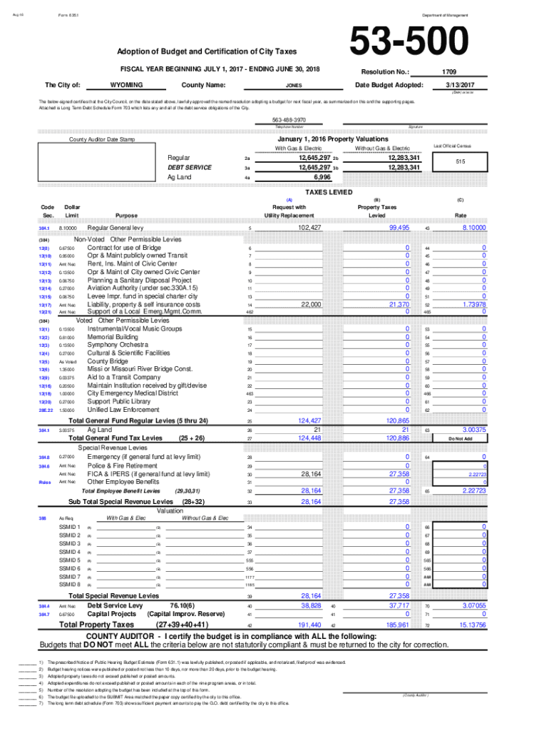 Aug16Form 635.1Department of Management153500Adoption of Budget and Certification of City Taxes FISCAL YEAR BEGINNING JULY 1, 2017, ENDING JUNE 30, 2018, The City of:County Name:WYOMINGResolution