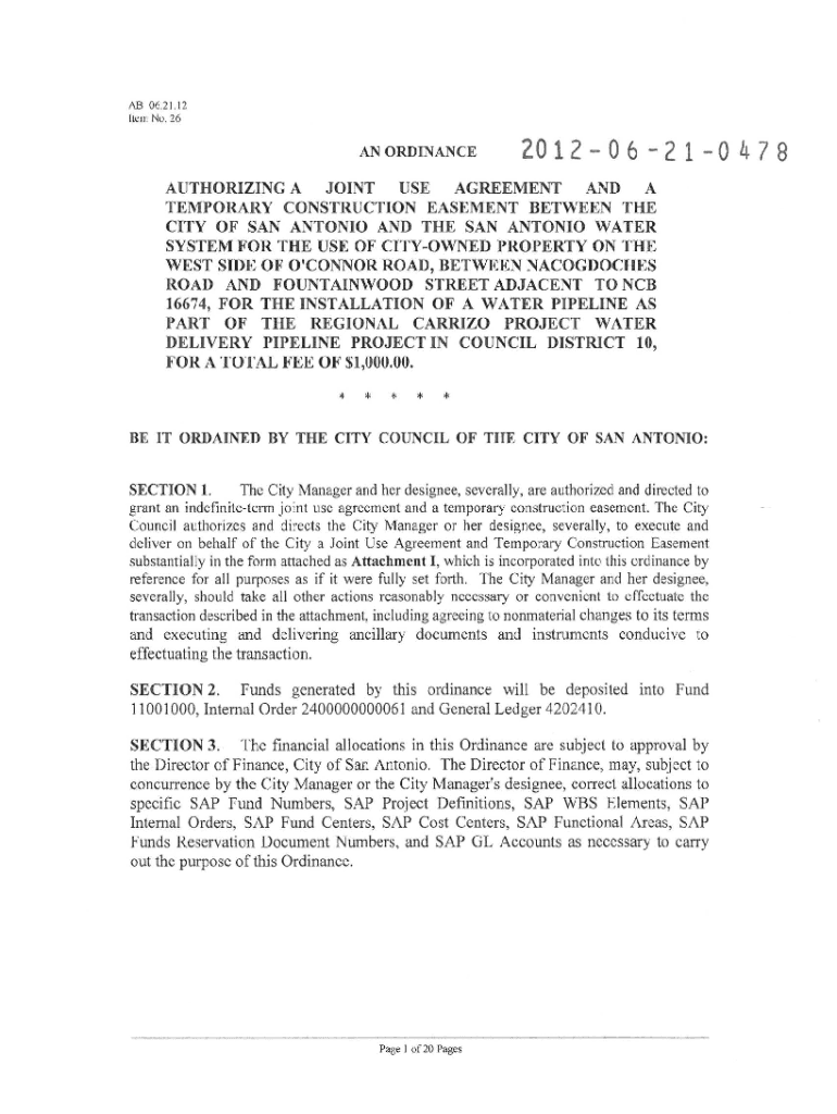 AB 06.2 1.12Item No. 26AN ORDINANCE20 1 Z 0 6 2 1 0 4 7 8AUTHORIZING A JOINT USE AGREEMENT AND A TEMPORARY CONSTRUCTION EASEMENT BETWEEN THE CITY OF SAN ANTONIO AND THE SAN ANTONIO WATER SYSTEM FOR