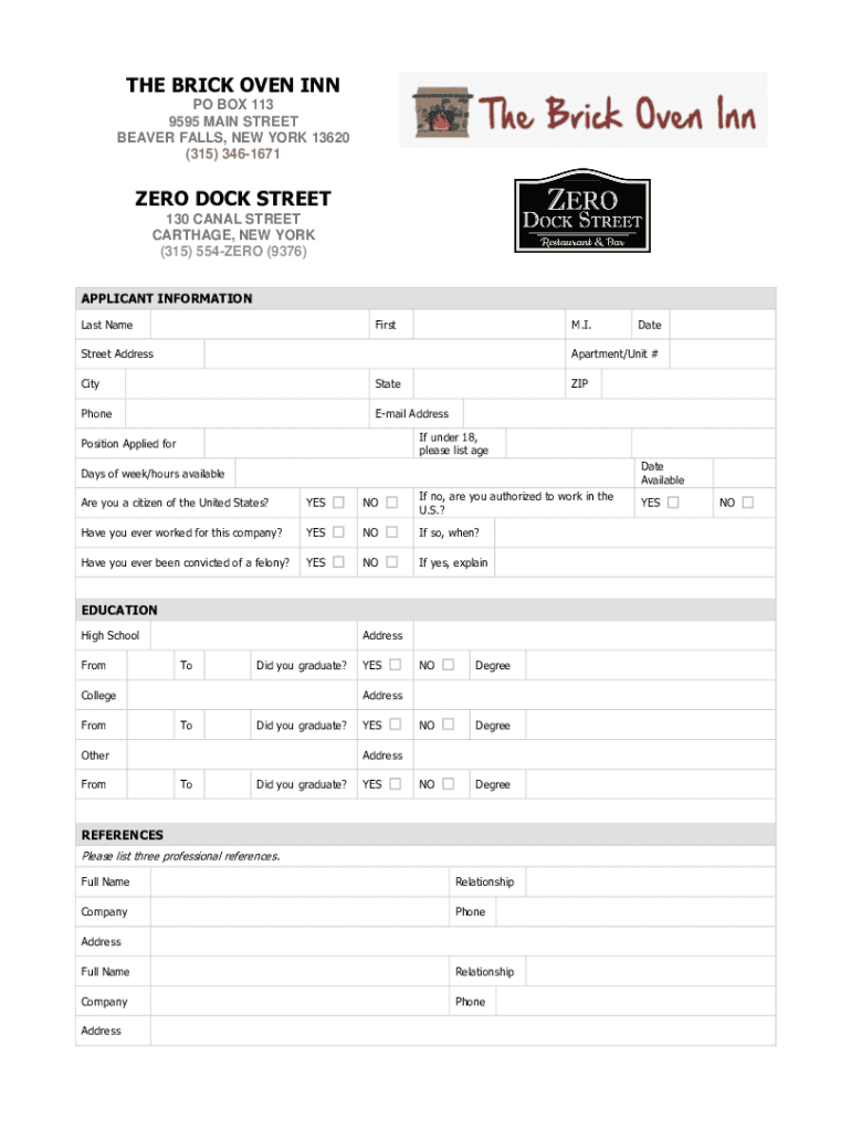 THE BRICK OVEN INN PO BOX 113 9595 MAIN STREET BEAVER FALLS, NEW YORK 13620 (315) 3461671ZERO DOCK STREET 130 CANAL STREET CARTHAGE, NEW YORK (315) 554ZERO (9376) APPLICANT INFORMATION Last NameFirstM.
