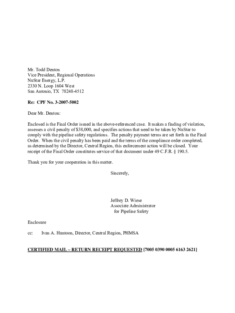 Mr. Todd Denton Vice President, Regional Operations Nu Star Energy, L.P. 2330 N. Loop 1604 West San Antonio, TX 782484512 Re: CPF No. 320075002 Dear Mr. Denton: Enclosed is the Final Order issued