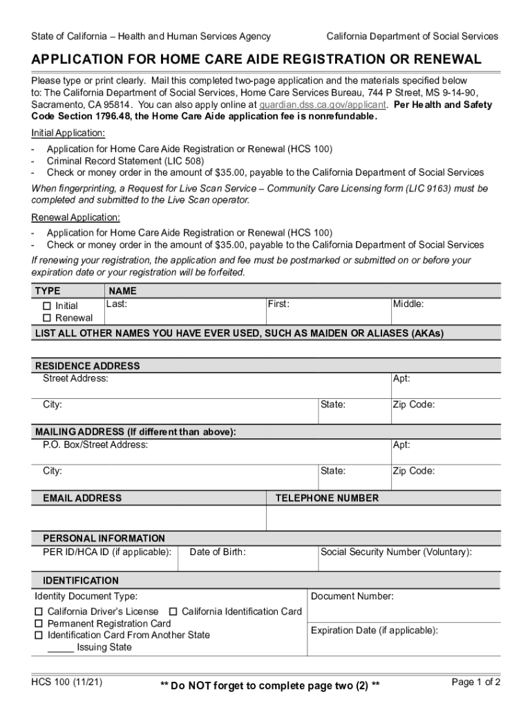 State of California Health and Human Services Agency California Department of Social ServicesAPPLICATION FOR HOME CARE AIDE REGISTRATION OR RENEWAL Please type or print clearly. Mail this completed
