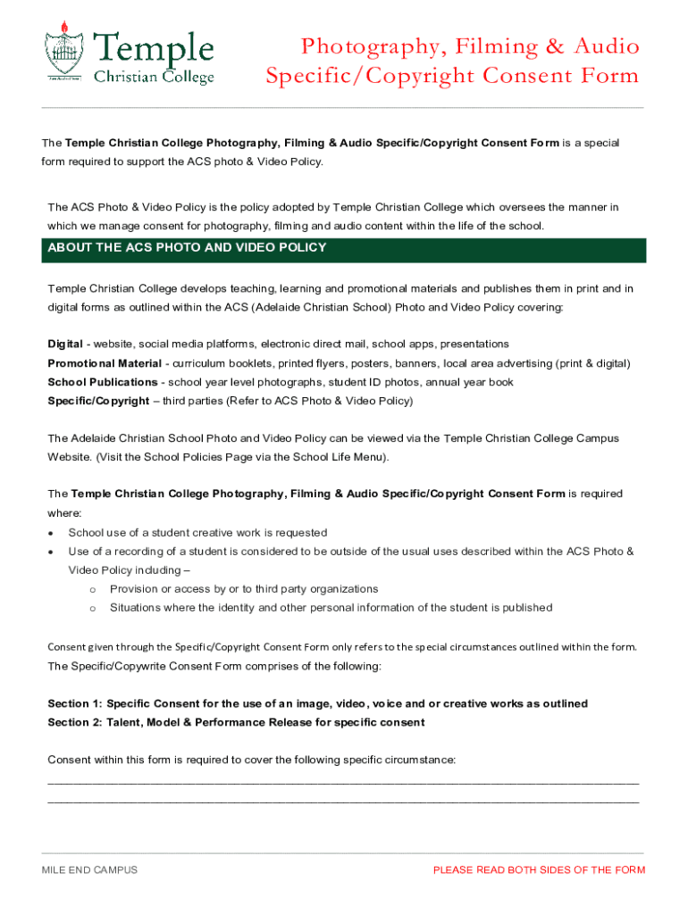Photography, Filming & Audio Specific/Copyright Consent Form The Temple Christian College Photography, Filming & Audio Specific/Copyright Consent Form is a special form required to support the ACS