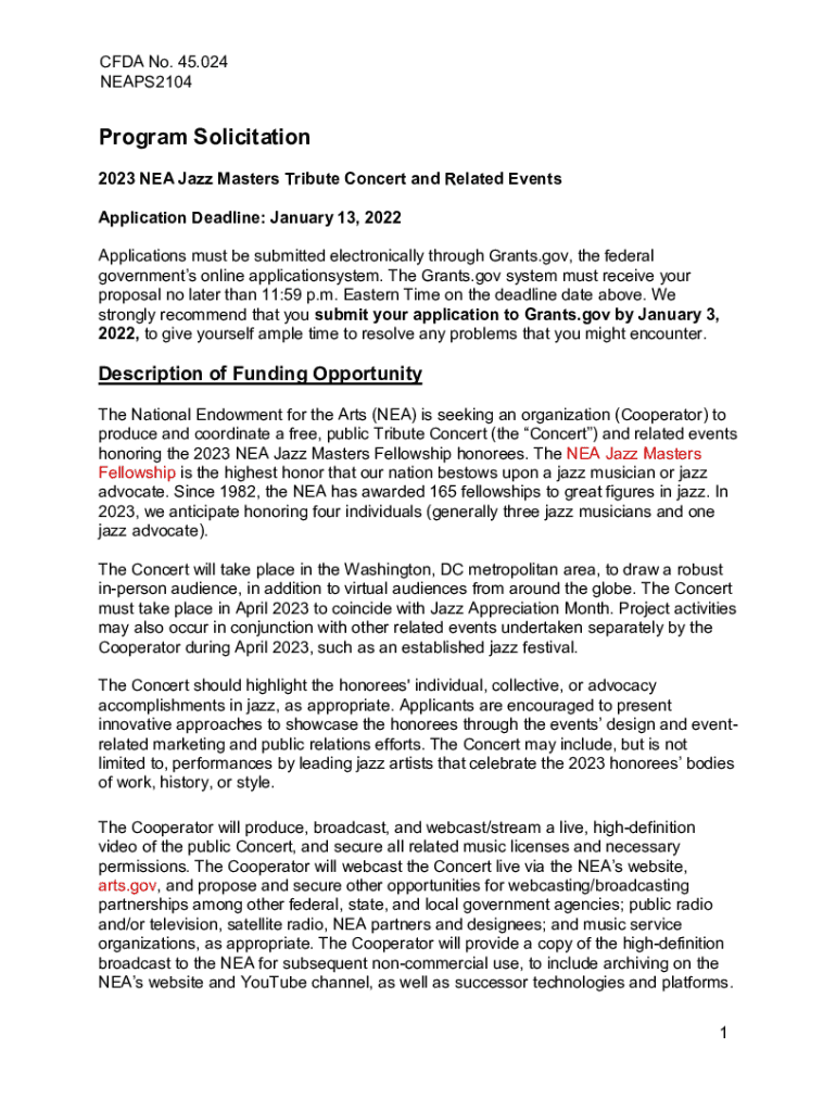 CODA No. 45.024 NEAPS2104Program Solicitation 2023 NEA Jazz Masters Tribute Concert and Related Events Application Deadline: January 13, 2022, Applications must be submitted electronically through