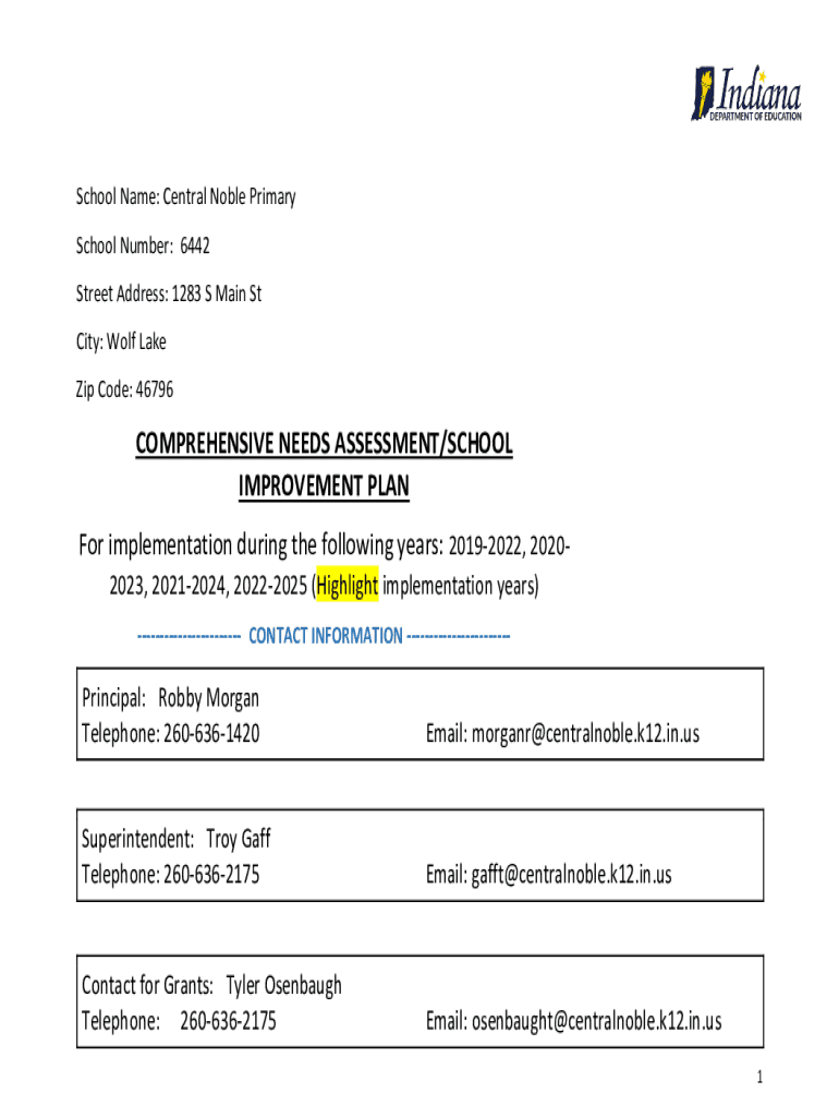 School Name: Central Noble Primary School Number: 6442 Street Address: 1283 S Main St City: Wolf Lake Zip Code: 46796COMPREHENSIVE NEEDS ASSESSMENT/SCHOOL IMPROVEMENT PLAN For implementation during