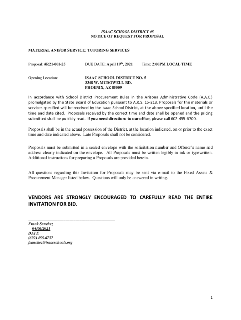 ISAAC SCHOOL DISTRICT #5 NOTICE OF REQUEST FOR PROPOSALMATERIAL AND/OR SERVICE: TUTORING SERVICESProposal: #R2100125DUE DATE: April 19th, 2021Opening Location:ISAAC SCHOOL DISTRICT NO. 5 3348 W. McDowell