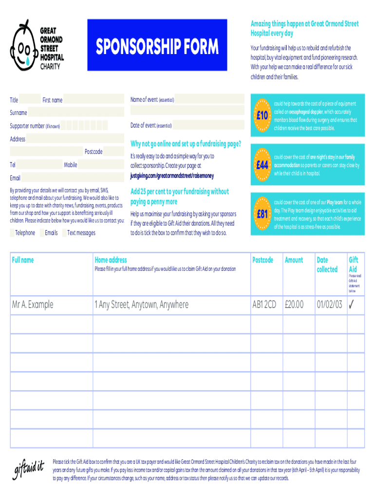 SPONSORSHIP FORM Title Surname Date of event (essential)Supporter number (if known) Address Postcode MobileEmail By providing your details we will contact you by email, SMS, telephone and mail about