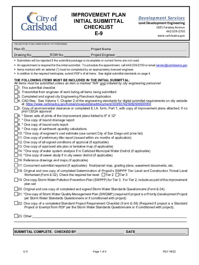 IMPROVEMENT PLAN INITIAL SUBMITTAL CHECKLIST E9Development Services Land Development Engineering 1635 Faraday Avenue 4423392750 www.carlsbadca.govTHIS SECTION TO BE COMPLETED BY CITY PERSONNELPlan