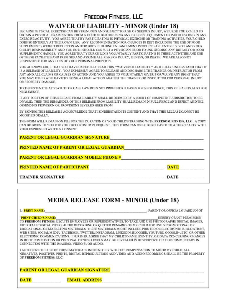 Freedom Fitness, LLC WAIVER OF LIABILITY MINOR (Under 18) BECAUSE PHYSICAL EXERCISE CAN BE STRENUOUS AND SUBJECT TO RISK OF SERIOUS INJURY, WE URGE YOUR CHILD TO OBTAIN A PHYSICAL EXAMINATION FROM