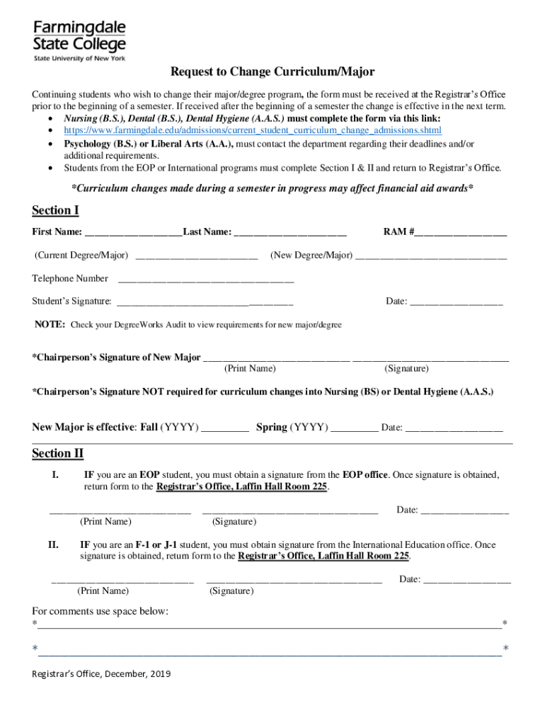 Request to Change Curriculum/Major Continuing students who wish to change their major/degree program, the form must be received at the Registrars Office prior to the beginning of a semester. If received