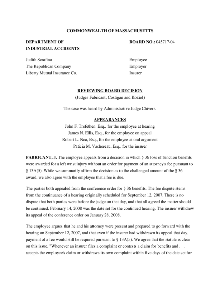 COMMONWEALTH OF MASSACHUSETTS DEPARTMENT ONBOARD NO.: 04571704INDUSTRIAL ACCIDENTS Judith Strafing The Republican Company Liberty Mutual Insurance Co. Employee Employer InsurerREVIEWING BOARD DECISION