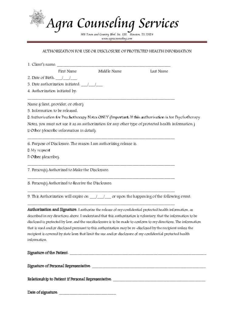 Agra Counseling Services 908 Town and Country Blvd. Ste. 120, Houston, TX 77024 www.agracounseling.comAUTHORIZATION FOR USE OR DISCLOSURE OF PROTECTED HEALTH INFORMATION 1. Clients name: ___ First