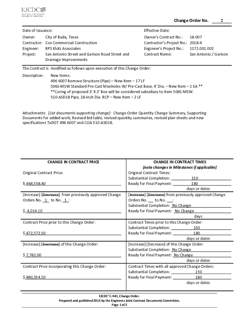 Change Order No. Date of Issuance: Owner: City of Bud, Texas Contractor: Cox Commercial Construction Engineer: RPS Klutz Associates Project: San Antonio Street and Garrison Road Street and Drainage