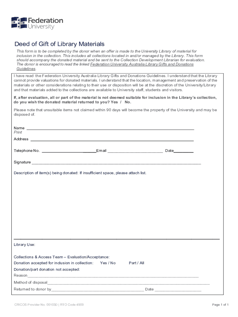 Deed of Gift of Library Materials This form is to be completed by the donor when an offer is made to the University Library of material for inclusion in the collection. This includes all collections