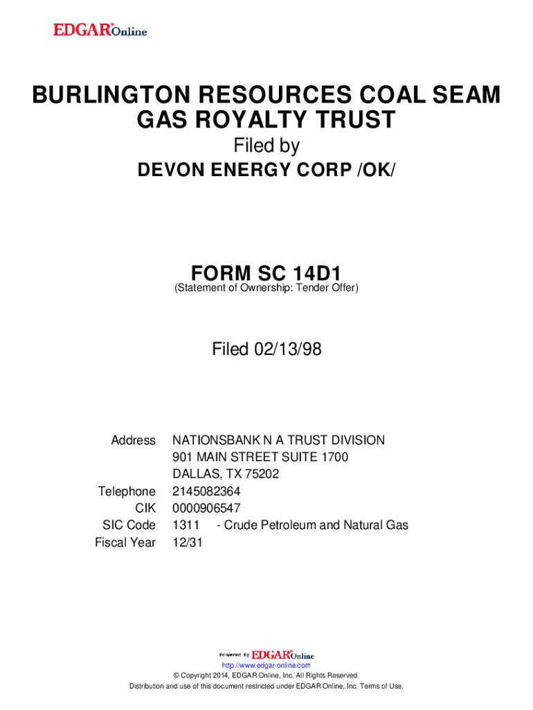 BURLINGTON RESOURCES COAL SEAM GAS ROYALTY TRUST Filed by DEVON ENERGY CORP /OK/FORM SC 14D1(Statement of Ownership: Tender Offer)Filed 02/13/98AddressTelephone CIK SIC Code Fiscal YearNATIONSBANK