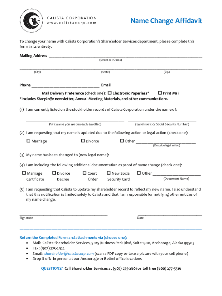 Name Change Affidavit To change your name with Batista Corporations Shareholder Services department, please complete this form in its entirety. Mailing Address ___ (Street or PO Box)___ (City)(State)(Zip)Phone