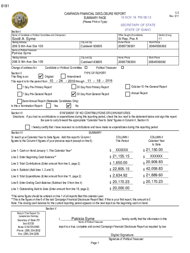 6181 C2 Rev. 5/11CAMPAIGN FINANCIAL DISCLOSURE REPORT 16 NOV 18 PM 08:12 SUMMARY PAGE (Please Print or Type) SECRETARY OF STATE OF IDAHOSection I Name of Candidate or Political Committee and ChairpersonOffice
