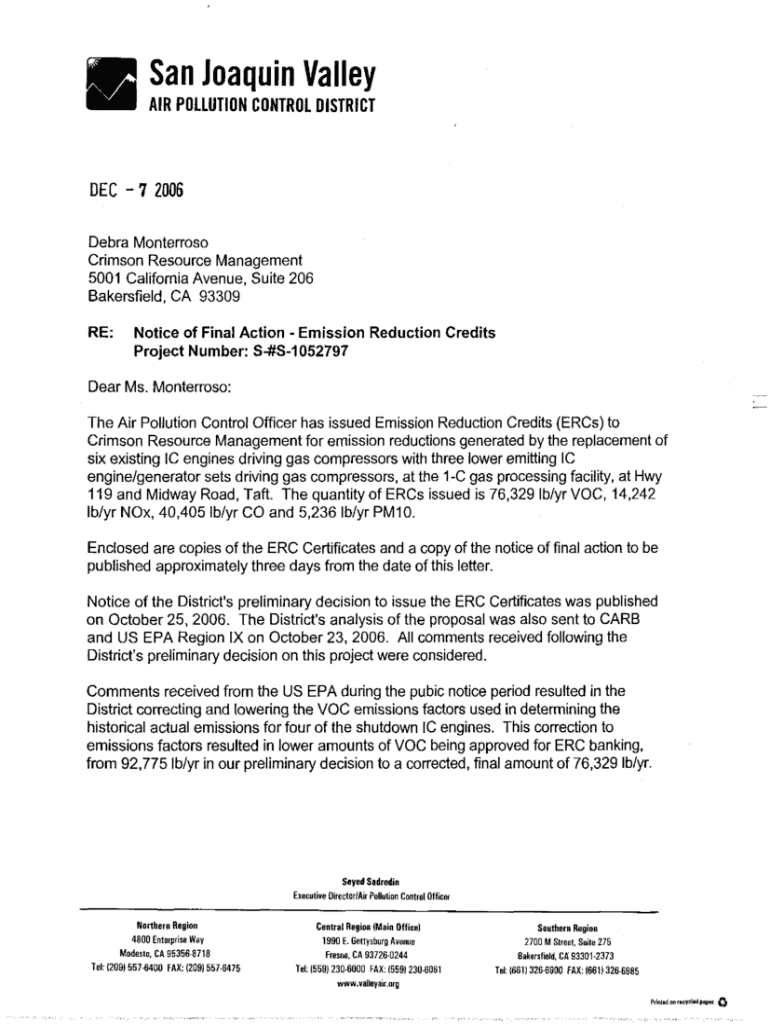 San Joaquin Valley AIR POLLUTION CONTROL DISTRICT DEC 7 2006 Debra Monterrosa Crimson Resource Management 5001 California Avenue, Suite 206 Bakersfield, CA 93309 RE:Notice of Final Action Emission