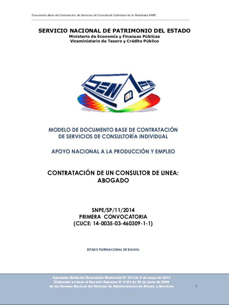 Document Base de Contratacin de Servicios de Consultora Individual en la Modality ANPE. ___SERVICE NATIONAL DE PATRIMONY DEL ESTATE Minister de Economa y Finances Pelican Viceministerio de Tesoro