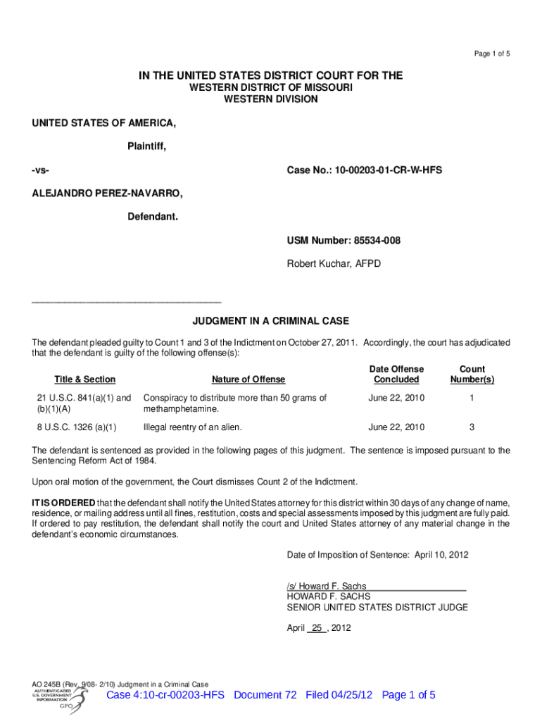 Page 1 of 5IN THE UNITED STATES DISTRICT COURT FOR THE WESTERN DISTRICT OF MISSOURI WESTERN DIVISION UNITED STATES OF AMERICA, Plaintiff, vs Case No.: 100020301CRWHFSALEJANDRO PEREZNAVARRO, Defendant.