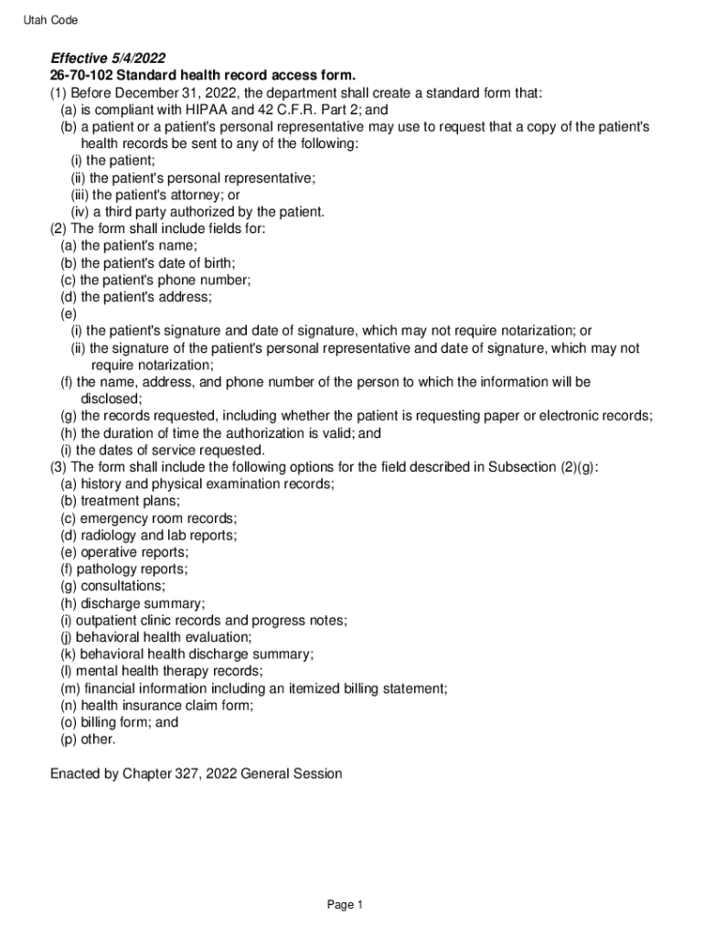 Utah Noneffective 5/4/2022 2670102 Standard health record access form. (1) Before December 31, 2022, the department shall create a standard form that: (a) is compliant with HIPAA and 42 C.F.R. Part