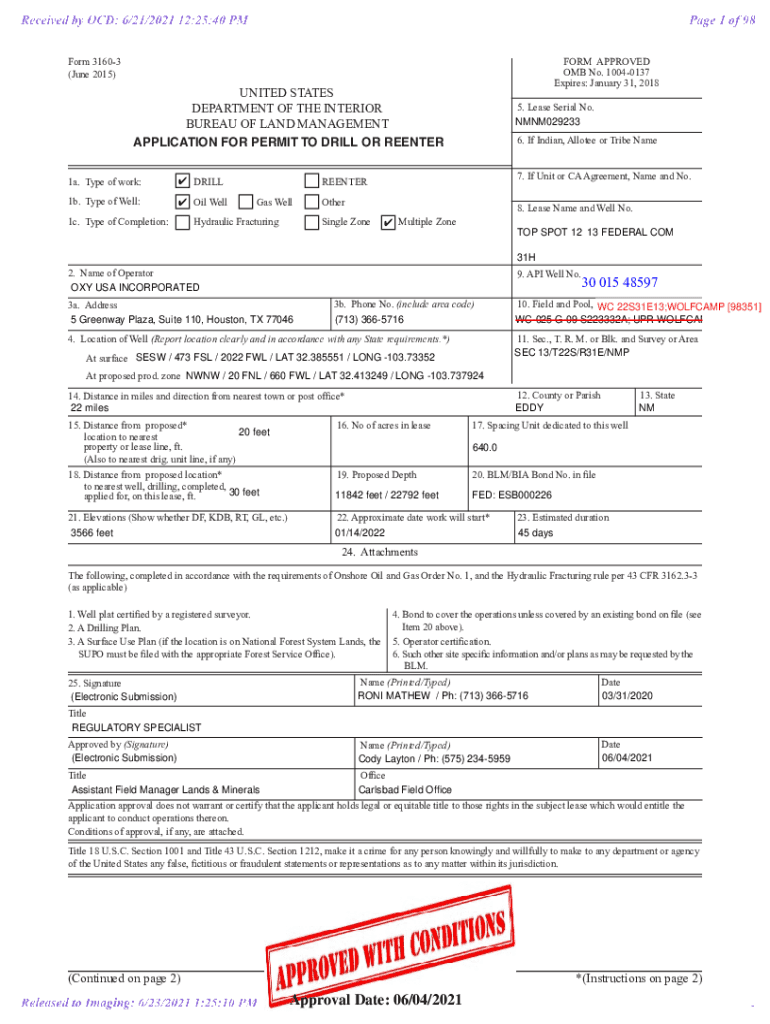 Form 31603 (June 2015)FORM APPROVED OMB No. 10040137 Expires: January 31, 2018UNITED STATES DEPARTMENT OF THE INTERIOR BUREAU OF LAND MANAGEMENT APPLICATION FOR PERMIT Drilling OR REENTER 1a. Type
