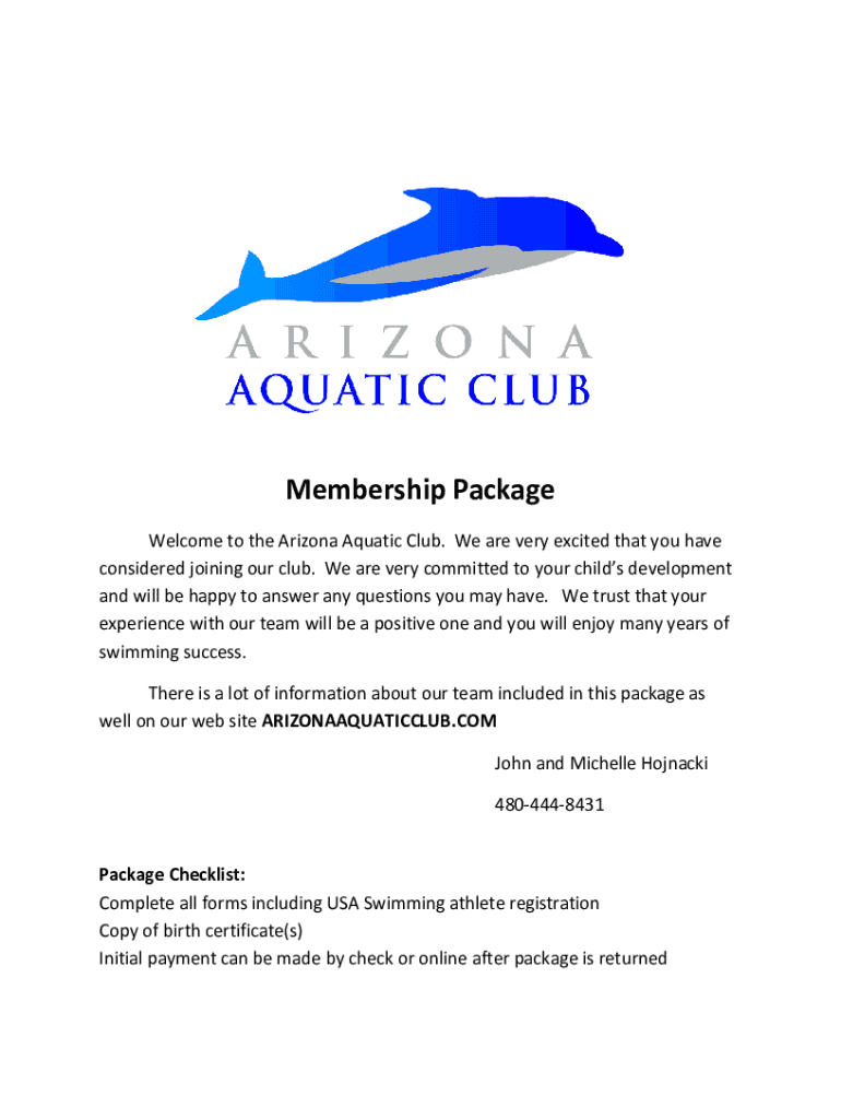 Membership Package Welcome to the Arizona Aquatic Club. We are very excited that you have considered joining our club. We are very committed to your children development and will be happy to answer