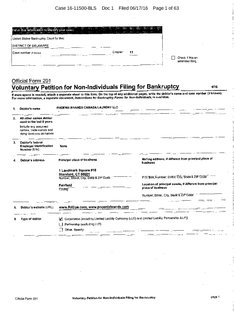 Case 1611500BLSDoc 1Filed 06/17/16Page 1 of 63United States Bankruptcy Court for the: DISTRICT` OF DELAWARE Chapter Case number ;rkown11 Check if this an amended filingOfficial Form 2014sVoluntary