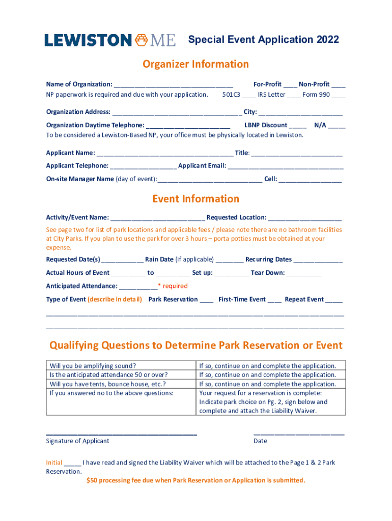 Special Event Application 2022 OrganizerInformation NameofOrganization:___ For-profit___Nonprofit___ NPpaperworkisrequiredandduewithyourapplication.501C3___Letter___Form990___ OrganizationAddress:___City:___