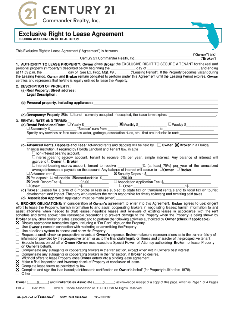 Exclusive Right to Lease Agreement FLORIDA ASSOCIATION OF REALTORSThis Exclusive Right to Lease Agreement (\” Agreement) is between Century 21 Commander Realty, Inc.(Owner) and (Broker)1. AUTHORITY