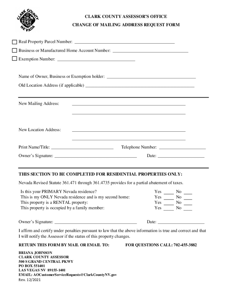 Get the free CLARK COUNTY ASSESSOR'S OFFICE CHANGE OF MAILING ...