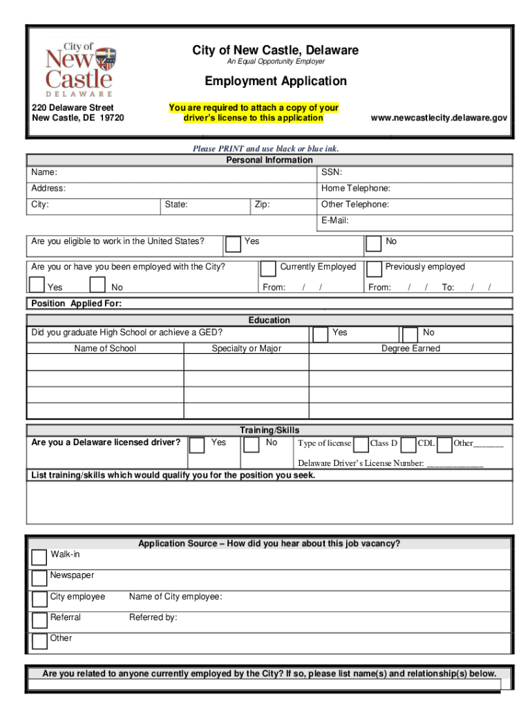 City of New Castle, Delaware An Equal Opportunity EmployerEmployment Application 220 Delaware Street New Castle, DE 19720You are required to attach a copy of your driver's license to this application.newcastlecity.