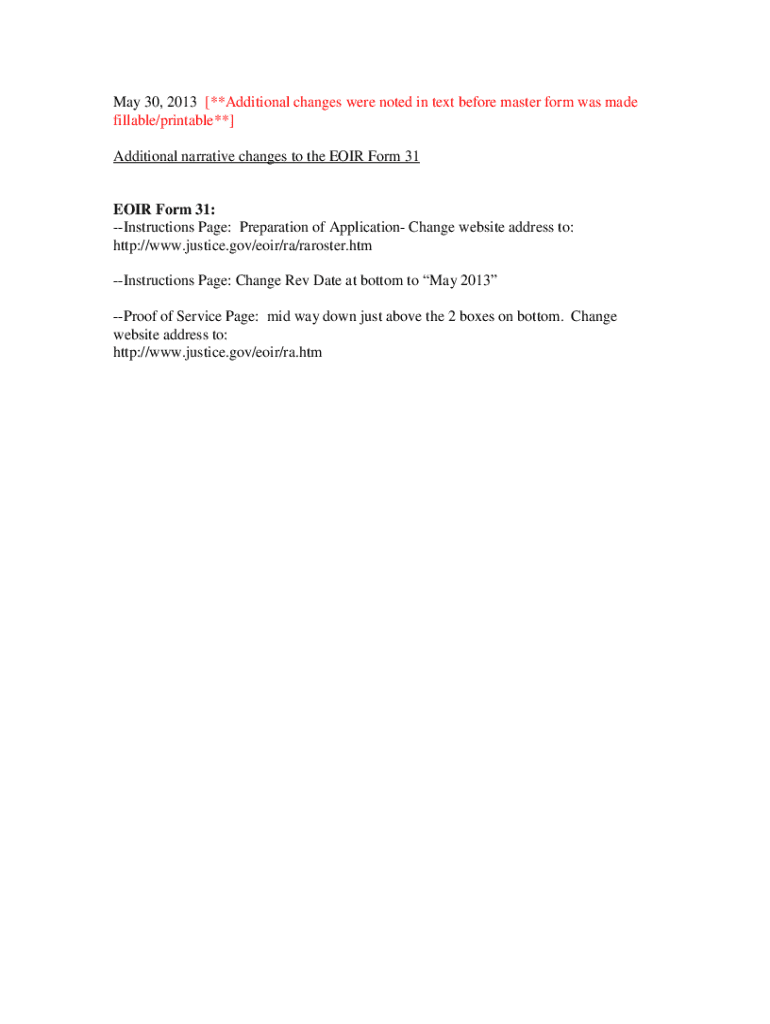 May 30, 2013 [**Additional changes were noted in text before master form was made fillable/printable**] Additional narrative changes to the EMIR Form 31EOIR Form 31: Instructions Page: Preparation