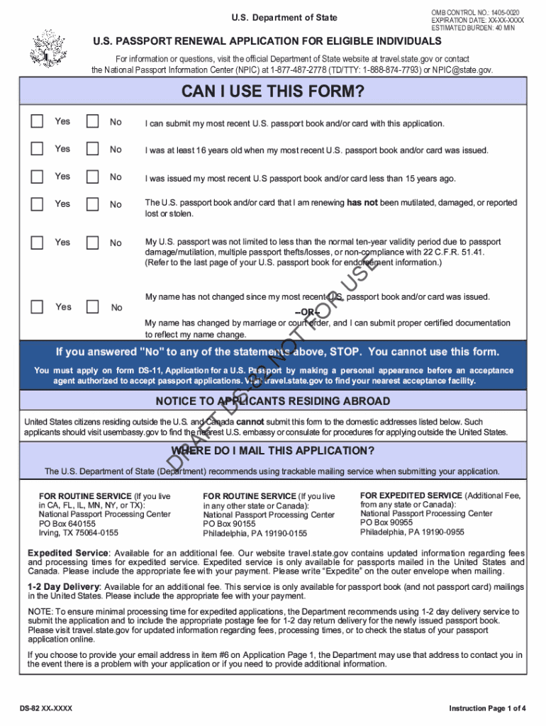 OMB Controls NO.: 14050020 EXPIRATION DATE: XXXXXXXX ESTIMATED BURDEN: 40 MIND. S. Department of State. S. PASSPORT RENEWAL APPLICATION FOR ELIGIBLE INDIVIDUALS For information or questions, visit