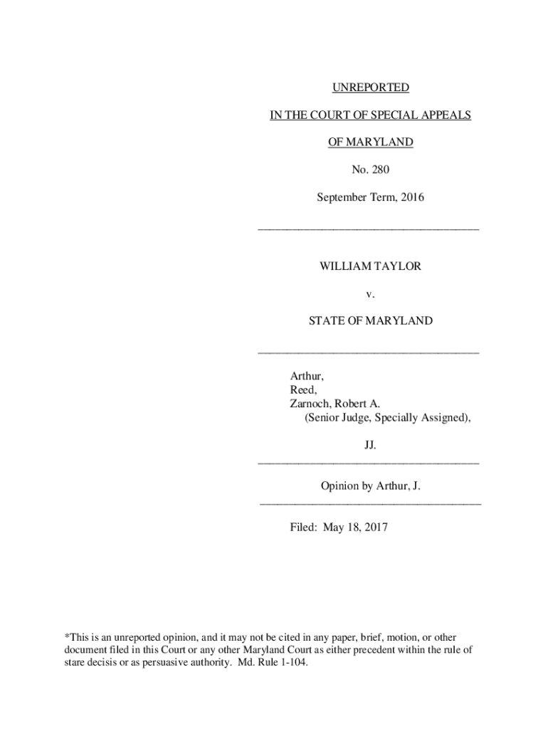 UNREPORTED IN THE COURT OF SPECIAL APPEALS OF MARYLAND No. 280 September Term, 2016 ___WILLIAM TAYLOR v. STATE OF MARYLAND ___ Arthur, Reed, March, Robert A. (Senior Judge, Specially Assigned), JJ.
